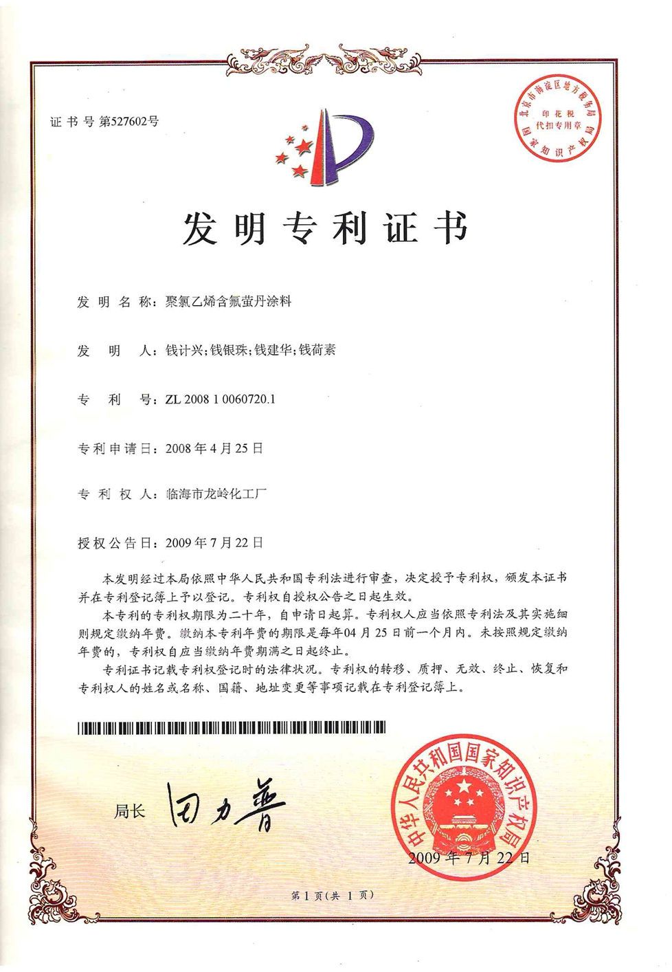 聚氯乙烯含氟螢丹涂料專利證書